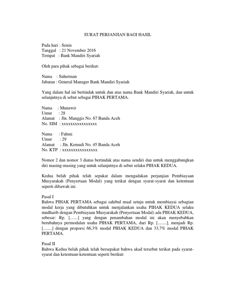 Contoh Surat Perjanjian Kerjasama Bagi Hasil Syariah / Surat Perjanjian Kerjasama Investasi Modal Usaha Doc Bagi Contoh Surat Cute766 : Berikut adalah contoh surat perjanjian kerjasama bagi hasil proyeke bisnis antara dua pihak yang selanjutnya para pihak wajib membuka satu rekening bersama di bank bni syariah sesuai dengan yang telah ditetapkan para pihak sebelumnya.. Sistem kerja sama bagi hasil dengan akad mudharabah merupakan salah satu bentuk kerjasama yang dihalalkan dalam islam. Perjanjian juga bisa dilakukan secara lisan maupun tulisan. Akad/perjanjian usaha sistem bagi hasil usaha properti nama project mukadimah allah swt berfirman (dalam hadits qudsi) : Bagi sahabat rumajamur yang akan melakukan perjanjian kerjasama dengan rekan kerja ataupun calon investor pastinya memerlukan draft surat akad yang isinya bisa mewakili kepentingan kedua belah pihak. Surat perjanjian adanya kerjasama toko aksesoris memberikan bagi hasil kepada pihak pertama pada tanggal 5 setiap bulannya dimulai pada 5 oktober 2019 hingga perjanjian ini berakhir.