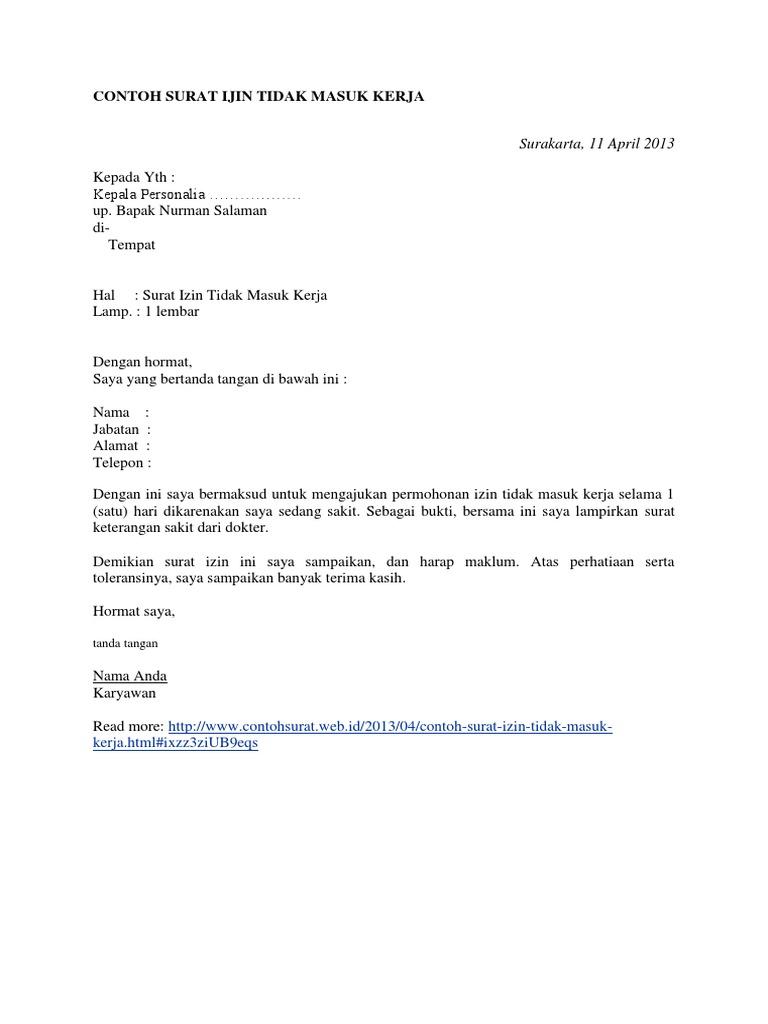 Surat izin cuti / libur kerja bagi karyawanmerupakan surat yang diajukan oleh seorang karyawan kepada pihak perusahaan atau instansi tempatnya bekerja yang isinya permohonan izin tidak bekerja untuk sementara waktu. Untuk mendapatkan file surat permohonan izin cuti kerja bagi karyawan yang tidak diproteksi dan bebas untuk diedit, silahkan anda kunjungi situs kami. Tidak hanya itu bagi yang sedang mencari surat izin usaha, keramaian, dan mengadakan acara juga memerlukan. Disebut surat pribadi karena ditulis perseorangan dan dinas karena. Contoh surat izin cuti kerja pdf. Yogyakarta, 20 november 2016 perihal. Daftar isi cara menulis surat izin yang baik dan benar contoh surat izin sakit tidak masuk sekolah aturan mengajukan izin tidak masuk kerja karena sakit memang berbeda dari satu perusahaan. Untuk mendapatkan file surat permohonan izin cuti kerja bagi karyawan yang tidak diproteksi dan bebas untuk diedit, silahkan anda kunjungi situs kami. 3 cara dan contoh menulis permintaan izin tidak masuk kerja yang baik dan benar melalui surat, email dan whatsapp / wa. Seperti contoh surat izin pada umumnya, untuk surat izin penyelenggaraan sebuah kegiatan ditulis dengan beberapa bagian. Berikut ini cara menulis surat izin dan juga contoh surat izin tidak masuk sekolah, tidak masuk kuliah, tidak masuk kerja, surat izin dari orang tua dll. Contoh surat pengunduran diri mahasiswa yang baik dan sopan. Bermadsud mengajukan permohonan izin cuti kerja selama 4 (lima) hari kerja mulai dari tanggal 23 oktober 2016 hingga 28 oktober 2016 dikarenakan menghadiri pernikahan adik.
