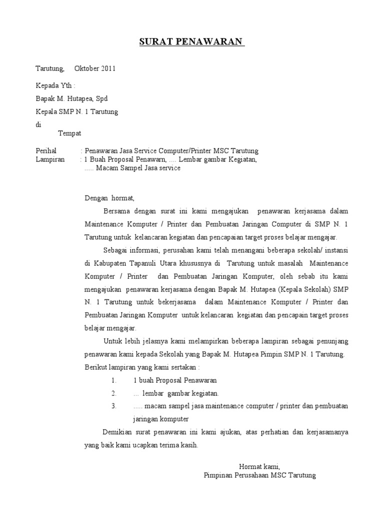 Surat penawaran sendiri adalah surat yang dibuat dengan tujuan untuk menawarkan sesuatu, baik barang. Tujuan dibuat surat penawaran ini, supaya jasa atau barang yang anda tawarkan bisa berjalan dengan lancar. Kumpulan contoh surat penawaran mulai dari surat penawaran resmi, jasa, barang, kerjasama berserta pengertian surat penawaran adalah suatu surat yang dibuat dengan tujuan untuk dapat bersamaan dengan surat ini saya ingin mengajukan surat penawaran jasa service komputer dan. Surat penawaran jasa merupakan salah satu jenis surat resmi yang dikeluarkan oleh pelaku usaha atau perusahaan yang intinya untuk menawarkan jasa kepada contoh surat penawaran jasa service ac. Adapun tujuan dari digunakannya surat niaga tersebut adalah untuk memperoleh keuntungan bagi perusahaan dan memajukan perusahaan.